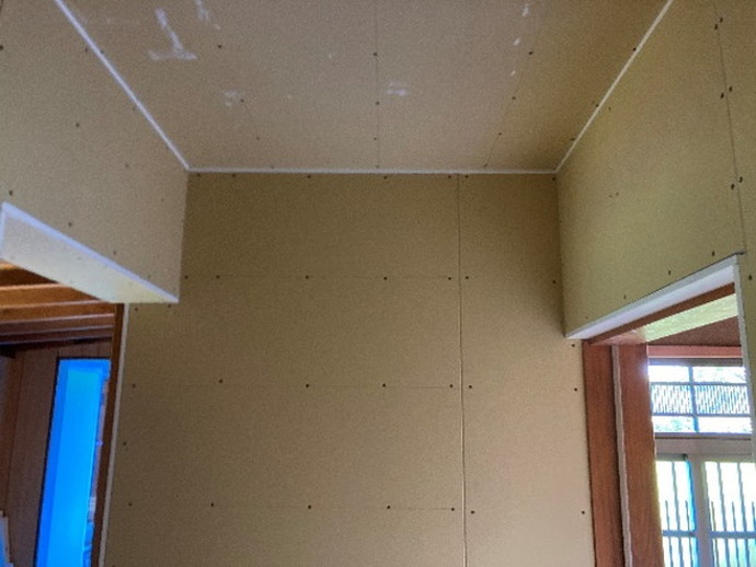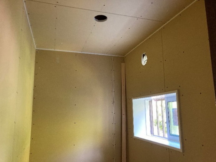 トイレ、洗面のあった所の壁はクロスを張り替えるので、新しく下地を作り、プラスターボードを貼ってここにクロスを貼っていきます。床のフロアも新しくするので古いフロアを剥がして、新しくします。
