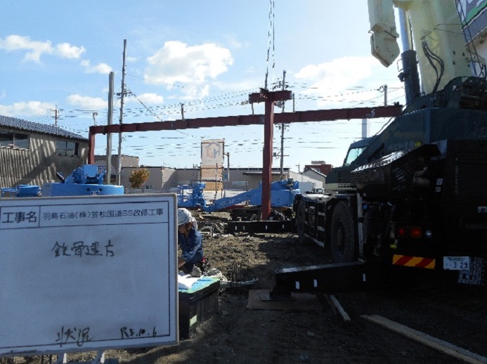 鉄骨を固定仮止めしたあと、測量工、鍛冶工の作業が済んでから鉄骨を固定。